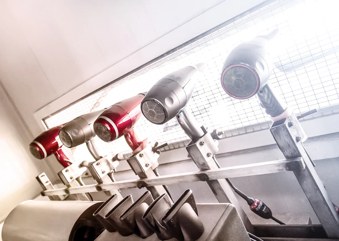 We have set up a test lab with appliances that run 24 hours a day to check all components and to keep our promises of durability and resistance. We have also developed machines that simulate the hairdresser's movements in order to repeat in the laboratory the stresses on the hairdryer at work, because for us the trust of professionals comes first.